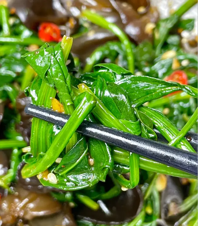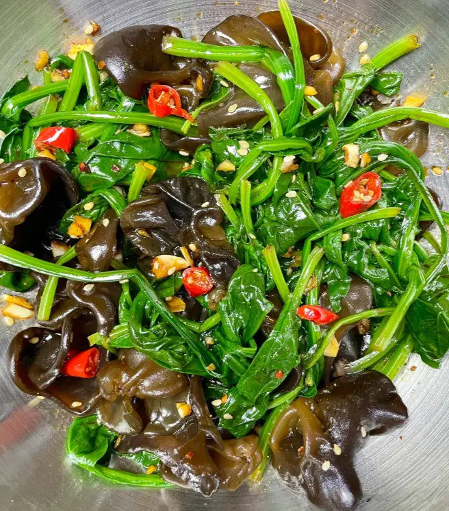 菠菜的鲜绿与木耳的乌黑形成鲜明对比,口感脆爽,酸甜适中,非常开胃。菠菜富含铁质和维生素,木耳则能清理肠道垃圾,这道菜既美味又健康,非常适合冬季养生。
