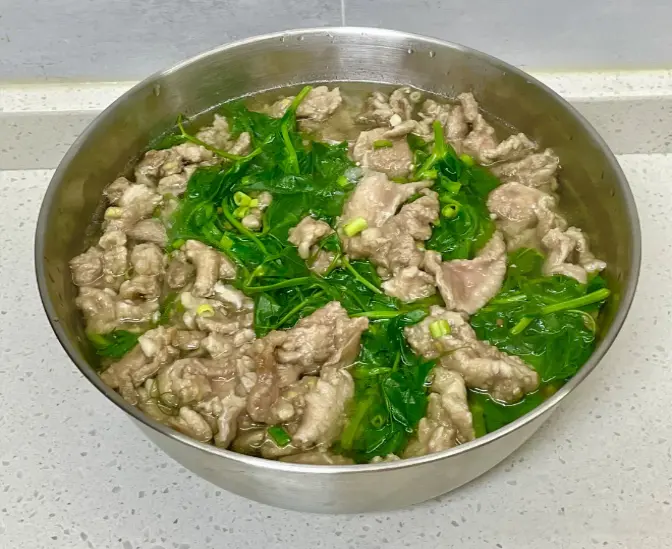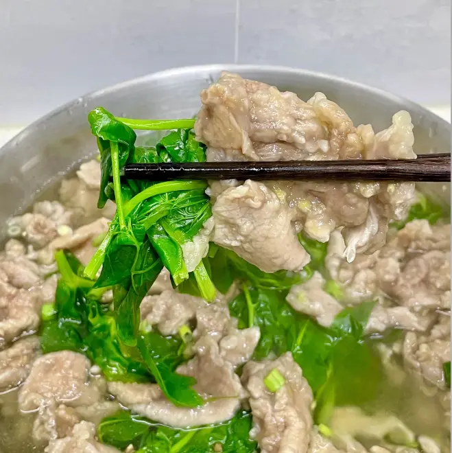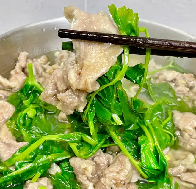 豌豆尖的清新与肉片的鲜嫩完美融合,汤色清澈,口感清爽不油腻,非常适合大寒时节。豌豆尖富含维生素和矿物质,猪肉则提供了优质的蛋白质和脂肪,这道汤既营养又易于消化,非常适合冬季进补。