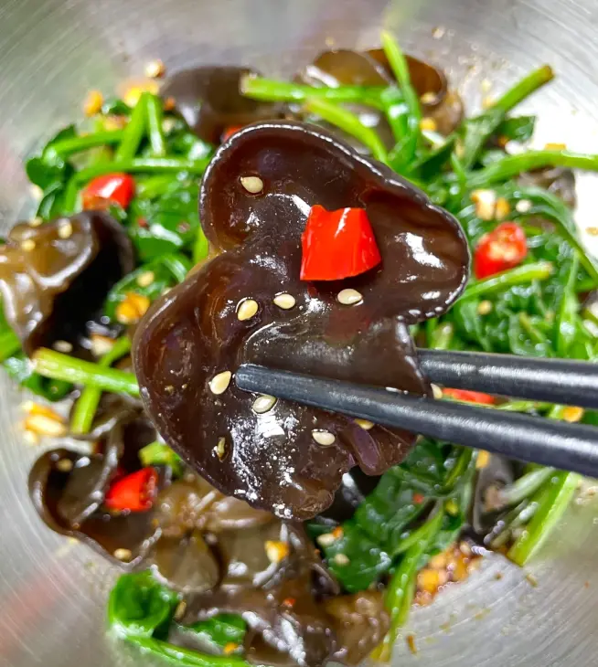 菠菜洗净,焯水烫熟,捞出沥干,切段。泡发好的木耳焯水煮熟,捞出沥干,切丝。将菠菜和木耳放入大碗中,加入蒜末、生抽、香醋、盐、糖和香油,拌匀即可。品鉴经验: